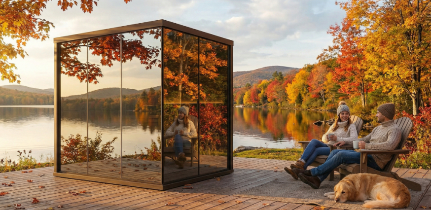 A design szauna egyik legfontosabb újítása a környezethez való alkalmazkodás módjában rejlik. Nappal a tükörfelületek visszaverik a tájat, a panoráma szauna élménye természetes része marad az épített környezetnek. Este a tér karaktere megváltozik: a meleg belső fények és a letisztult anyaghasználat védett, csendes atmoszférát hoznak létre. Ez az újító szemlélet nem a látványról szól, hanem arról, hogy a modern szaunaház hosszú távon is kiegyensúlyozottan működjön.