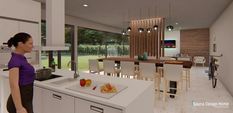Ennél a minimalizmus jegyében készült családi háznál, fontos szerepet kaptak a fa betétek, de nagyon figyeltünk a szolid felhasználásra. A nappalit és az étkezőt egy igényesen kialakított fa térelválasztó különíti el.